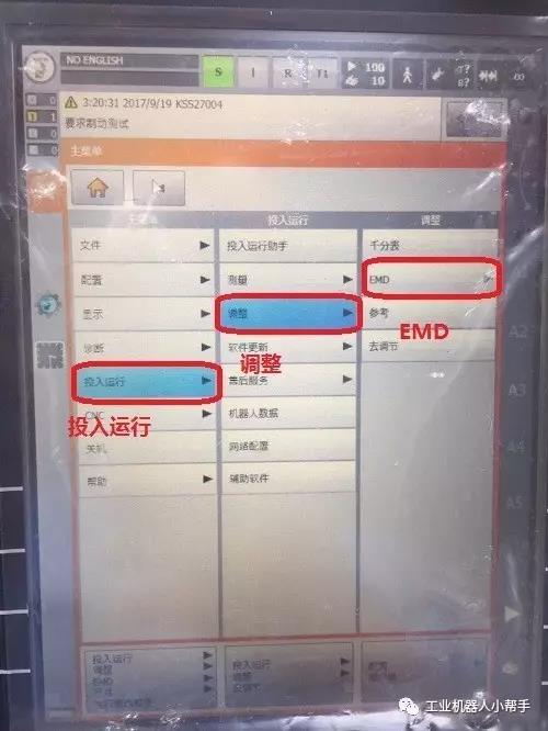 step 4:點擊示教器主菜單鍵,選擇投入運行-調整-EMD-標準-執行零點標定;